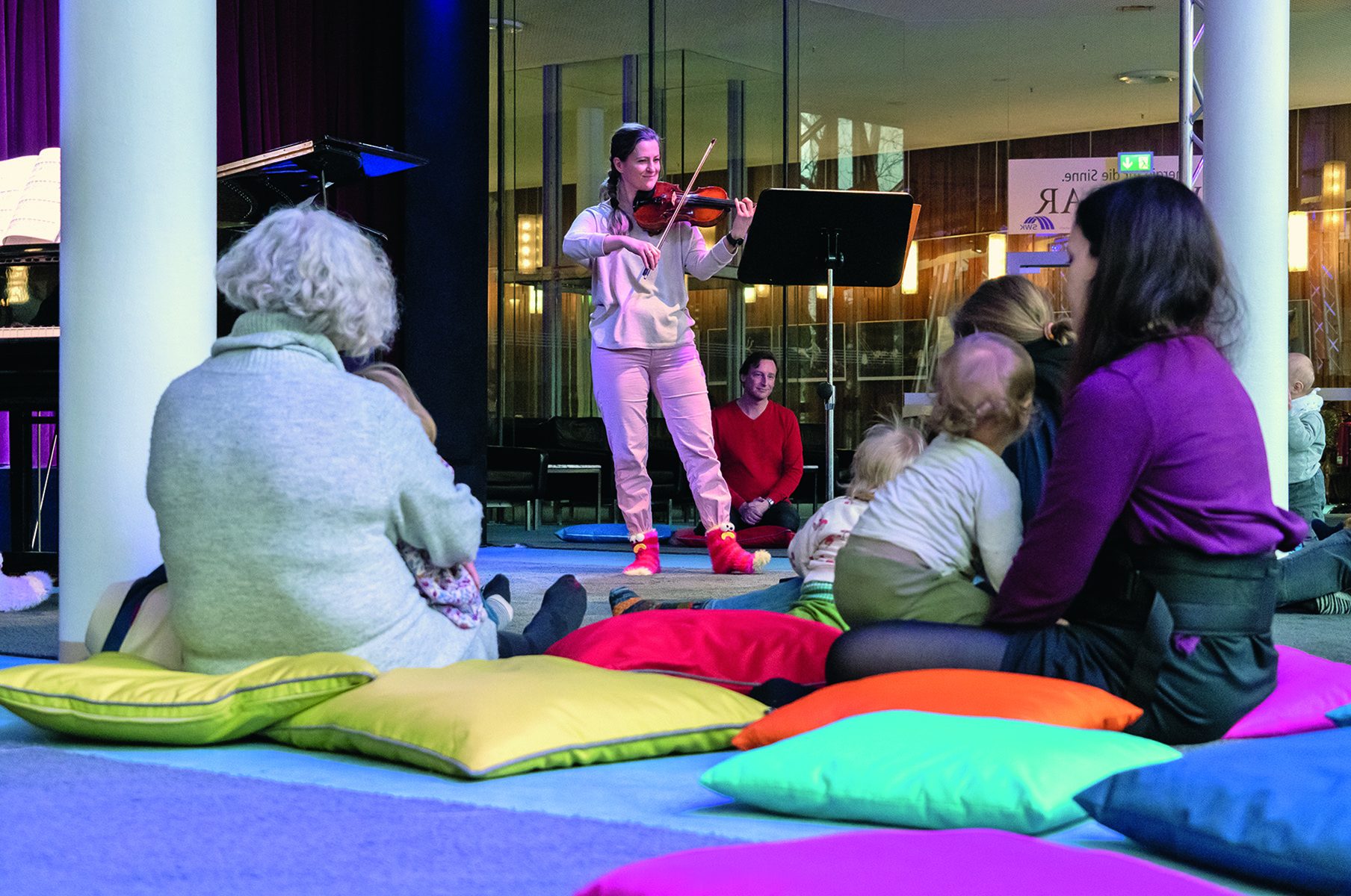 In entspannter Atmosphäre erleben die Säuglinge und Kleinkinder in diesen rund 30-minütigen Konzerten verschiedene Instrumente und Klangfarben eines Kammerensembles (Duo, Trio oder Quartett). Krabbeln, bewegen zur Musik, mitsingen, die Instrumente von ganz nah ansehen, … alles ist erlaubt.